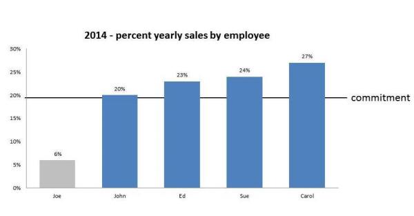 Second, you want to answer the "Why do I care?" question in your chart. For instance, you might include a title for your churn talk that reads, "Customer churn at a five-year high." In our sample illustration, it is clear that Joe isn't meeting his yearly sales commitment.