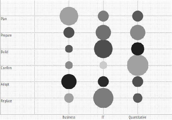 Active involvement by business users is critically important to the “plan” and “adopt” phases of the development process. The graphic below provides a typical allocation of the effort for each phase of a successful project. Actual percentages vary from project to project, but relative contribution by skill set typically remains consistent.