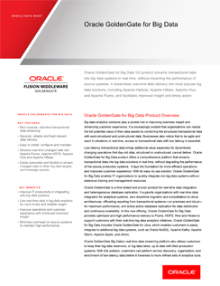 Oracle GoldenGate for Big Data 12 c product streams transactional data into big data systems in real time, without impacting the performance of source systems. It streamlines real - time data delivery into most popular big data solutions, including Apache Hadoop, Apache HBase, Apache Hive, and Apache Flume, and facilitates improved insight and timely action.