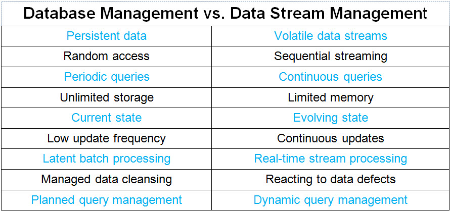 Data streams are among the most challenging of big data sources. Most of us are familiar with the concept of streaming data through experiences of streaming music or video. We’ve seen what happens when network bandwidth or processor speed is insufficient—the video freezes and skips panes; the music skips and stutters. Freezes, skips, and stutters can also happen in streaming analytics (e.g., while streaming a Twitter feed to a real-time customer sentiment dashboard). The user experience will be equally frustrating and the consequences may be much more severe than in streaming for entertainment. The streaming analytics pipeline begins with data streams and typically ends with data visualization. Much processing occurs between the two endpoints to filter and aggregate data, manage moving time windows for data of interest, apply analytic algorithms, and render charts and other data visualizations. Data stream management is arguably more difficult than database management. Managing data in motion is certainly different from managing data at rest. The table below itemizes the significant differences between database management and data stream management. A Closer Look Persistent data vs. volatile data streams: Data in databases is persistent—it is available to be processed at your convenience and can be reprocessed in the event of an error. Data streams are transient and must be processed as the data passes through the stream processor. Delayed processing is not an option, and reprocessing or replay is only possible if initial processing stores the data. Random access vs. sequential streaming: Data in databases is randomly processed using keys and indexes. Streams arrive sequentially, with each record processed in the order it arrives. Periodic queries vs. continuous queries: Applications using data from databases issue queries when they need to access data. Streaming applications, such as a real-time dashboard query, enable the continuous flow of real-time data to the consumer. Unlimited storage vs. limited memory: Database processing can assume virtually unlimited storage. Data volume doesn’t severely constrain processing capacity. Stream processors work with data in memory, and memory is far from unlimited. The distributed, fault-tolerant processing fundamental to big data technologies such as Hadoop is essential for stream processing. Current state vs. evolving state: Database-oriented applications collect, store, and report data about the current state of something of business interest. The data is inherently state-oriented. Stream processing receives data in real time and frequently must create a view of the evolving state across a sliding time window. Low update frequency vs. continuous update: Database applications have relatively low frequency of updates that is typically driven by a similarly low velocity of transactions. Streaming applications update continuously (e.g., constantly refreshing visual objects on a real-time dashboard). Latent batch processing vs. real-time stream processing: Database processing, such as extract, transform, and load (ETL), processes data in batches. Batch processing always involves data latency. Smaller and more frequent batches, often called minibatches, reduce but do not eliminate latency. Real-time stream processing achieves near-zero data latency. True zero latency isn’t realistic because processing always takes some time—even if it’s only milliseconds. Some stream processors use a microbatch concept—extremely small batches and exceptionally high frequency processing to achieve extreme low-latency. Managed data cleansing vs. reacting to data defects: Many of the data transformations in an ETL process are designed to improve data quality. These types of transformations are practical in batch processing but difficult to achieve with real-time stream processing. Complex transformations that work with data groups and data relationships simply aren’t practical in stream processing. Streams must react to data defects with operations such as filtering. Planned query management vs. dynamic query management: In the world of databases, query optimization is a common practice. We structure and organize data for query performance, and we use the query optimization features of database management systems. Stream processors must respond to query management in real time as continuous queries occur. Query optimization in stream processing uses features of parallel processing and workload distribution. Summary Dave Wells is actively involved in information management, business management, and the intersection of the two. As a consultant, he provides strategic guidance for business intelligence, performance management, and business analytics programs. He is the founder and director of community development for the Business Analytics Collaborative.
