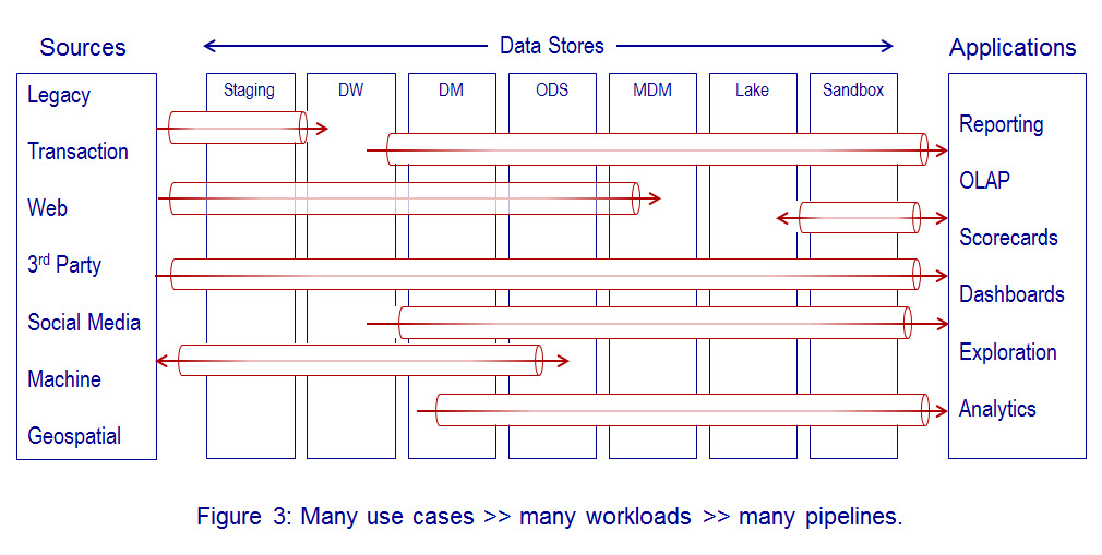 We need to rethink design principles for data movement—think data pipeline instead of data flow. Data flow to a single point of integration (data warehouse) is no longer enough. The variety of users and use cases creates the need to have many data pipelines—perhaps as many as one per use case. A pipeline delivers data to the point of consumption, not to a reservoir from which it can be drawn. The pipeline is optimized to use data, not to store data. Figure 3 illustrates the concept of multiple data pipelines.