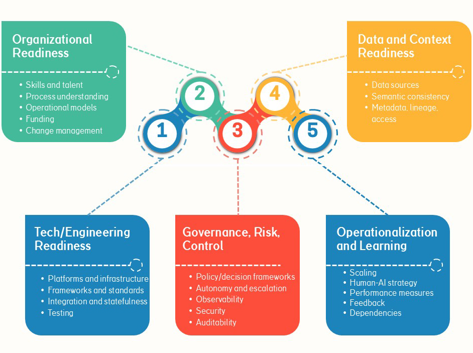 The assessment evaluates readiness across five critical dimensions: Organizational Readiness, Data and Context Readiness, Tech and Engineering Readiness, Governance, Risk, and Control Readiness, and Operationalization and Learning Readiness. Together, these dimensions reflect what organizations must have in place before agentic AI can move from experimentation to sustainable, enterprise-grade use.